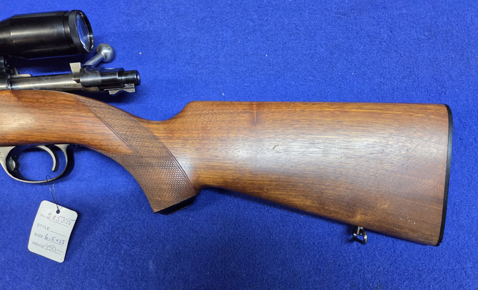 Husqvarnan metästyskivääri ruotsin mauserin kaliiperiissa 6,5x55. Kiikarille ei ole laskettu arvoa.