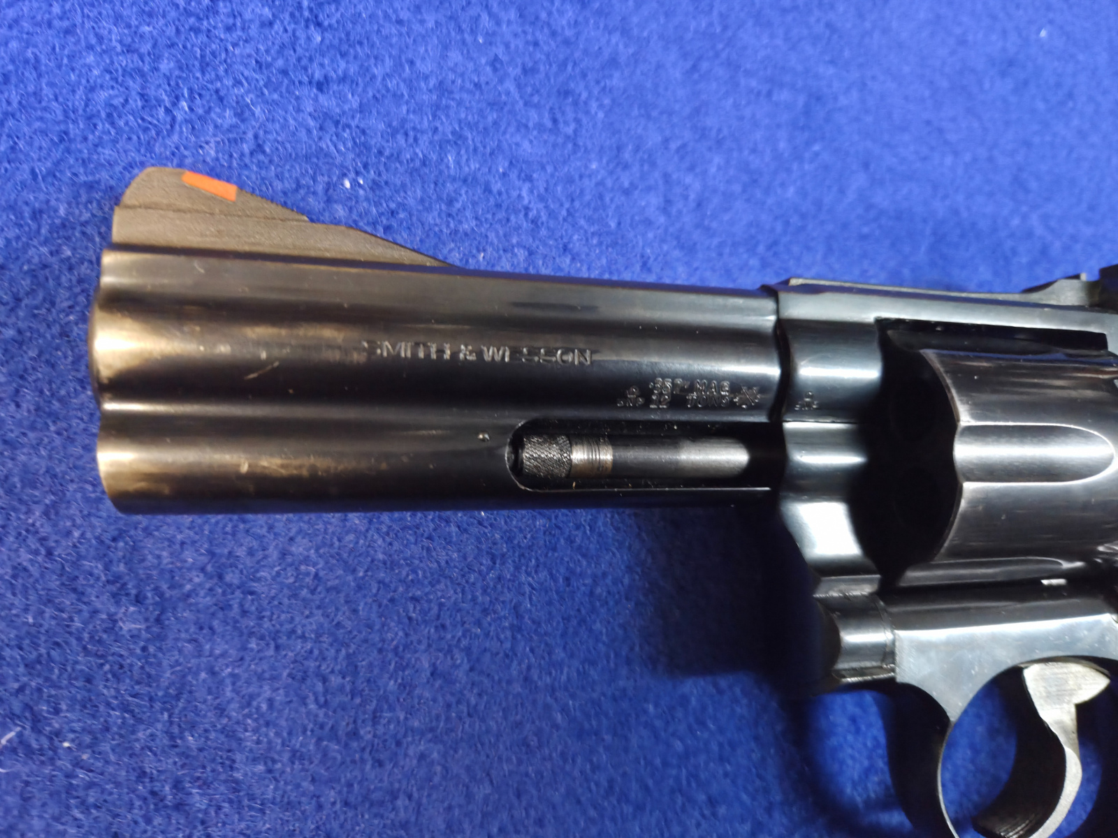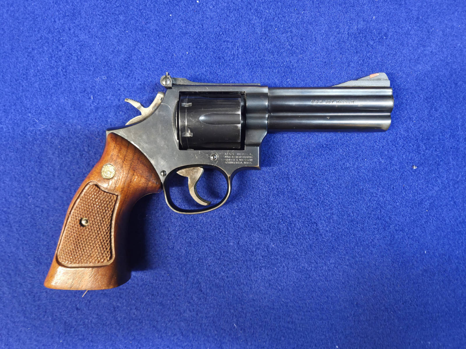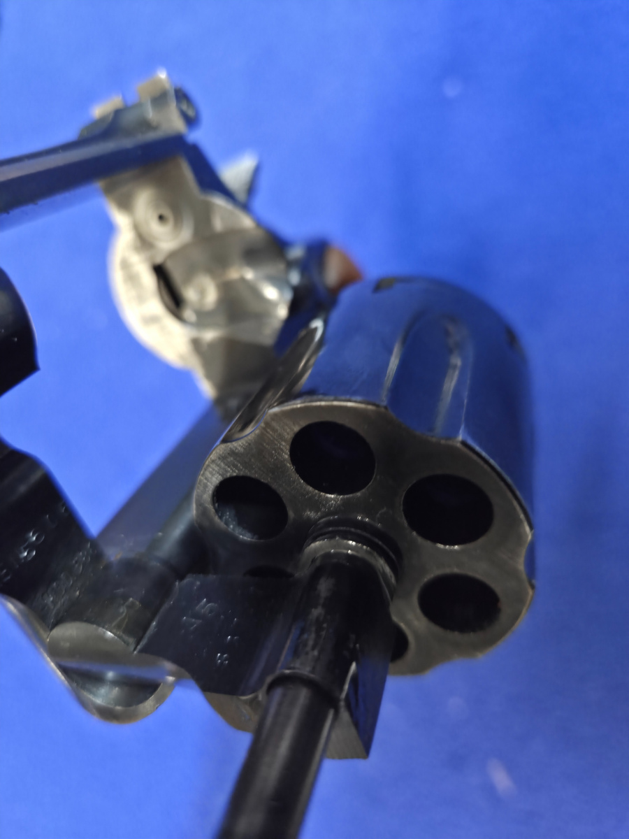 Smith&Wesson 586 kaliiperi .357mag. Ns. 0-variaatiota. 4 tuuman piippu. Teknisesti timmi ja kunnossa mutta ammuttu on sekä säilytetty kotelossa, joten sinistys kulunut sieltä täältä.