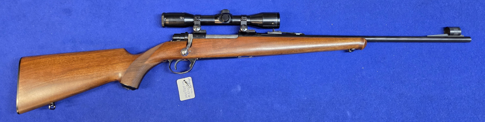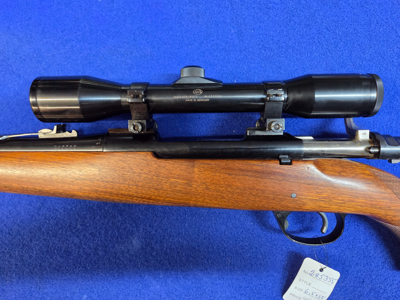 Husqvarnan metästyskivääri ruotsin mauserin kaliiperiissa 6,5x55. Kiikarille ei ole laskettu arvoa.