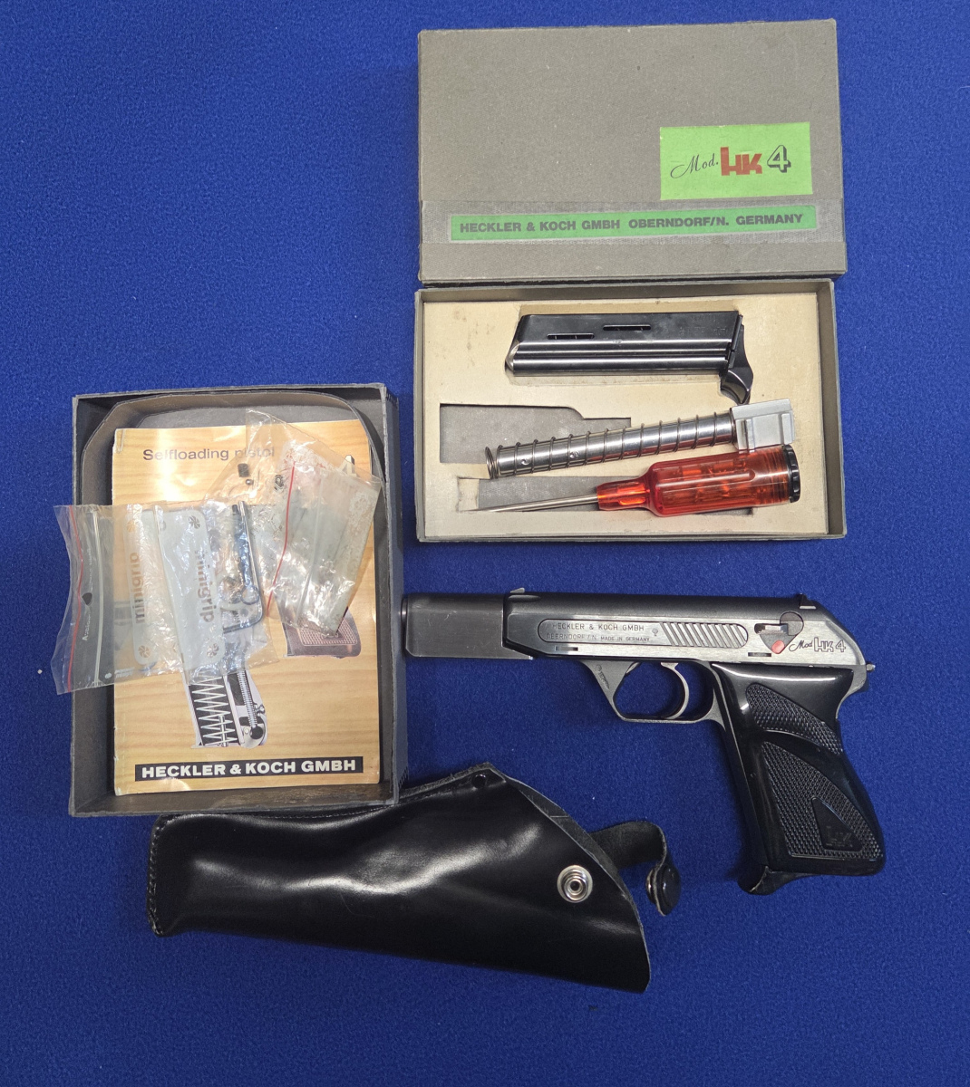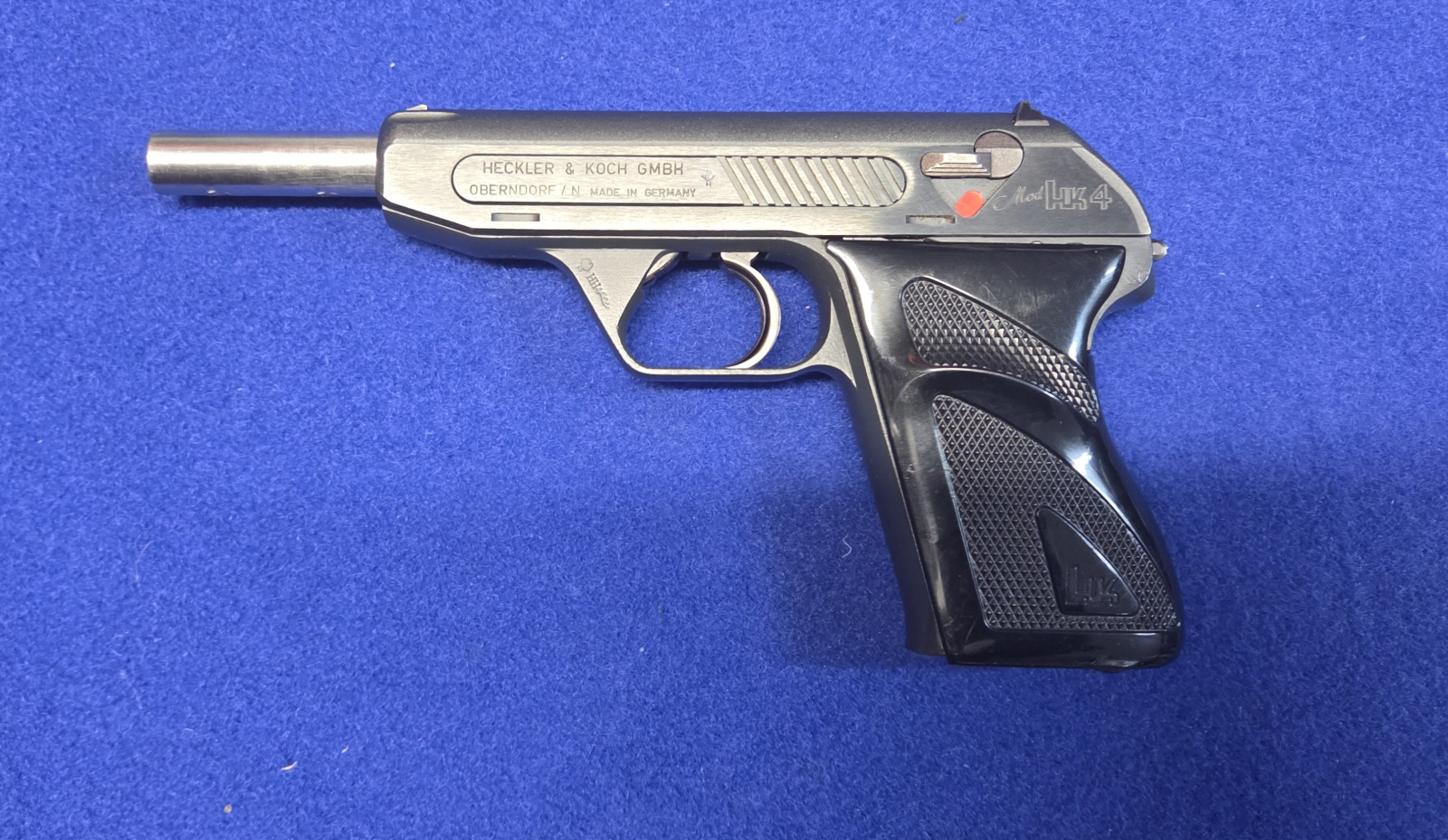 Hekler&Kochin HK4 pistooli kaliiperissa 7,65 br ja siihen .22 lr vaihtosarja.